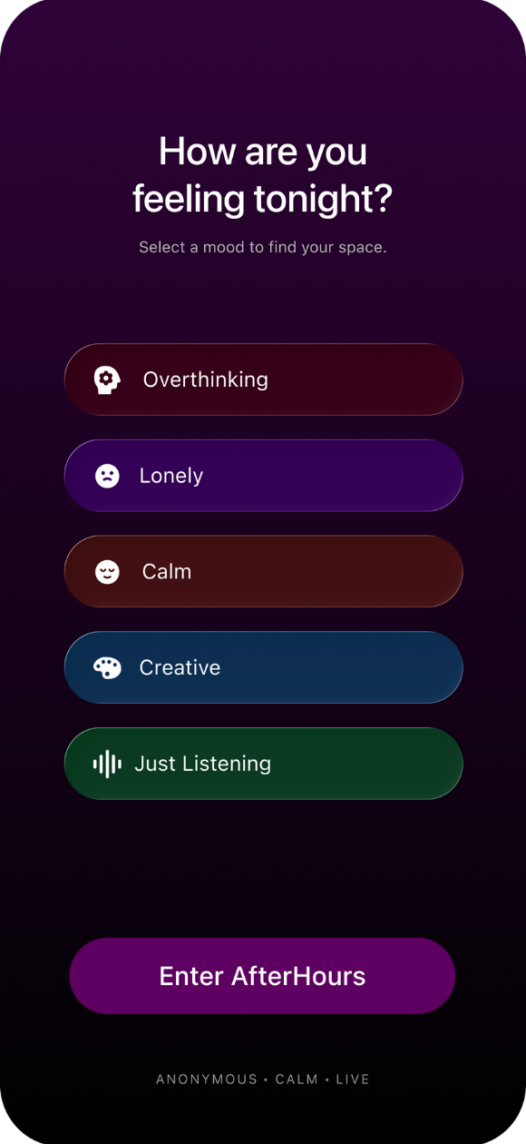 AfterHours is an anonymous, mood-based social space designed for emotional safety — available on Mobile and in immersive VR.