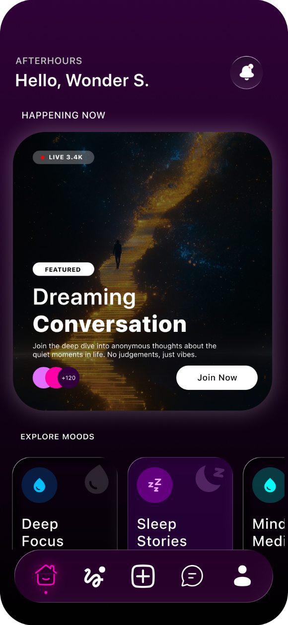 Join AfterHours and experience a social platform built for emotional safety, empathy, and real connection — on mobile and in immersive VR.