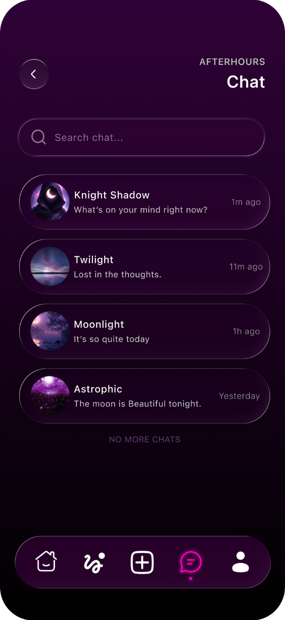 Access your emotional space anytime, anywhere. The AfterHours mobile app lets you express, connect, and reflect — safely and anonymously. No pressure. No performance. Just presence.